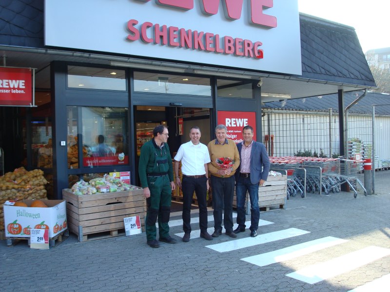 -jb- Waldbreitbach: Stolz präsentiert Marktleiter Holger Schenkelberg seinen neuen REWE – Markt in Waldbreitbach. Nach 4,5 Wochen Umbauzeit wurde dieser am 23. Oktober wiedereröffnet. Geplant war der Umbau schon länger, schließlich liegt die Eröffnung des Marktes, damals noch als Minimal mit 1987 schon eine Zeitlang zurück. Nötig wurde der Umbau aber jetzt durch die dringende Modernisierung der Kühlanlagen. Die wurde auch gleich zum Anlass genommen, um den kompletten Markt nach den neuesten Kriterien umzubauen. Marktleiter Schenkelberg, der den Markt seit 1996 leitet und auch schon die Umfirmierung 2001 von Minimal auf REWE mitgemacht hat, ist stolz auf seinen neuen Markt und auf sein Team, zu dem viele Angestellte seit vielen Jahren gehören. „Es war auch für mein Team eine schwere Zeit, durch die vielen Aufgaben die während des Umbaus zusätzlich auf meine Angestellten zukamen, aber sie haben sie mit enormer Einsatzbereitschaft und Flexibilität gemeistert. Ihnen gebührt ein großes Lob.“ Auch die Kunden, die nicht nur aus Waldbreitbach kommen, reagieren begeistert und freuen sich auf das neue Einkaufserlebnis im REWE Waldbreitbach. Als eine der ersten Kunden gratulierten Holger Schenkelberg (2. v.l.)auch die Vorstandmitglieder des Gewerbeverbands Waldbreitbach Werner Böhm, Klaus Peter Paffhausen und Aki Hertling (v.l.)