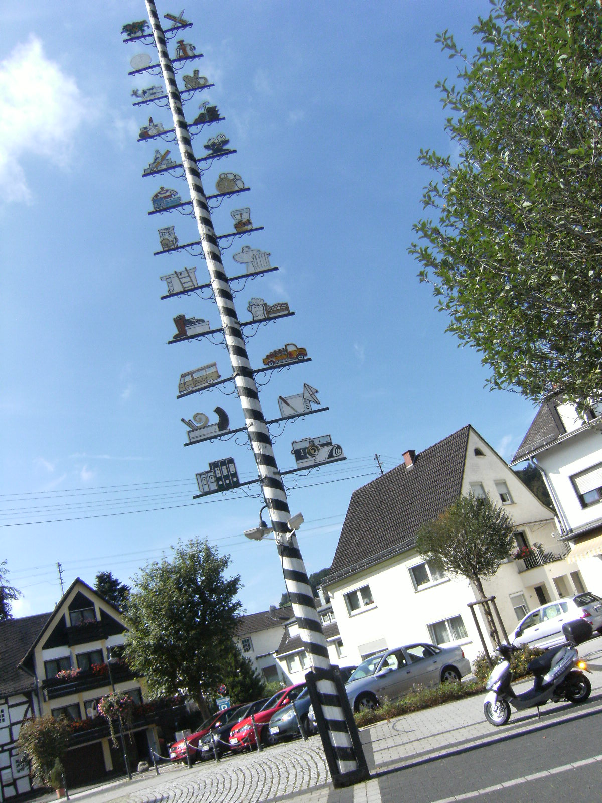 Bisher wurden nur hölzerne Masten verwendet. Das erste Exemplar wurde laut Alt-Bürgermeister Karl Willi Engels an gleicher Stelle 1991 im Mai zur Vorbereitung der 100-Jahr-Feier des Verkehrsvereins errichtet. Das Exemplar tat mit bereits damals 24 Gewerbe- und Aktivitätszeichen lange Jahre treu seine Dienste, wurde jedoch laut Engels nach etwa 10 Jahren vorsorglich durch einen neuen Stamm ersetzt. Nach weiteren 10 Jahren, am 05.01.2012 wurde der bereits witterungsgeschädigte Baum von Sturmtief „Andrea“ umgerissen. Das Folgeexemplar wurde, dieses Mal mit neuen gestalteten Gewerbebildern, am 29.11.2013 errichtet. An einem Spätsommertag, wurde jedoch auch dieses Exemplar am 13.09.2018 gegen 14Uhr das Opfer einer starken Windböe des Sturms „Sebastian“. Die Trümmer stürzten in den Bereich der Bushaltestelle und auf die lebhaft befahrene Hauptstraße. „Wie durch ein Wunder ist damals und bereits 2012 nichts und niemand zu Schaden gekommen“, erinnert sich Klaus-Peter Paffhausen, Vorsitzender des Gewerbeverbandes.
