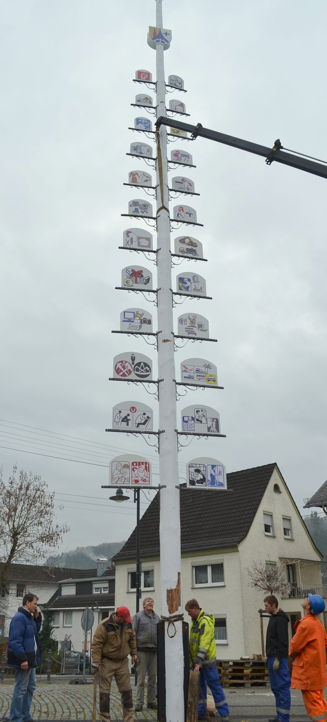 WALDBREITBACH. Der lange vermisste Ständebaum oder Zunftbaum steht wieder an seinem Platz in der Ortsmitte am alten Kreuz. Der Gewerbeverband hat sein Wahrzeichen und der Ort eine Landmarke wieder in voller Größe zurück.