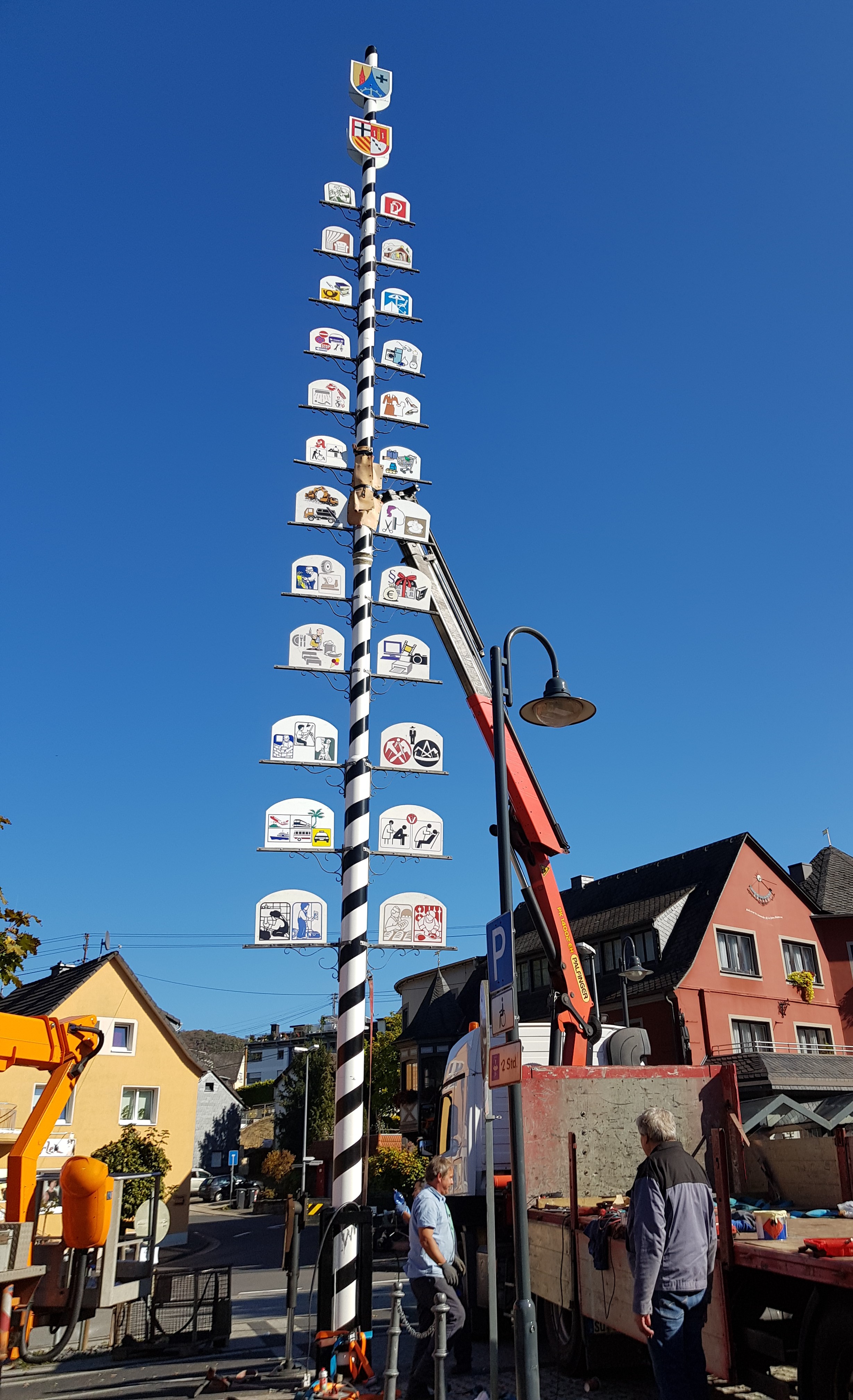 Am 10. Oktober wurde der neue Stahlmast mit Hilfe der Herstellerfirma und zahlreichen Helfern am angestammten Ort wieder errichtet. Ein weiteres Spezialunternehmen half mit einer Hebebühne für die Feinarbeiten aus. Nachdem 24 Gewerbezeichen seitlich montiert waren und die Wappen von Waldbreitbach und der VG Rengsdorf -Waldbreitbach ihren Platz an der Spitze gefunden hatten stand der 18m hohe und insgesamt rund eine Tonne schwere Mast mithilfe zweier Kräne exakt um 13Uhr 30 in der Senkrechten.